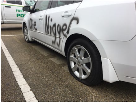 The graffiti on the car read "Die nigger." But the message went beyond the spray paint. All four tires had been slashed, a window was smashed and the car's interior was soaked in gasoline.