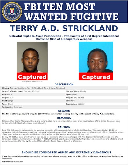Terry A.D. Strickland, a 24-year-old Wisconsin man on the FBI's Ten Most Wanted Fugitives list, was captured Sunday, Jan. 15 at a traffic stop in El Paso, Texas. Strickland was charged with fatally shooting two men in Milwaukee, Wisconsin, on July 17, 2016 and was captured without incident.
