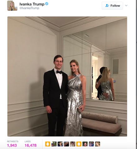 Ivanka Trump on Saturday posted a photo of herself and her husband, senior White House adviser Jared Kushner, decked out in formal wear — as immigrants with legal paperwork were detained at airports across the country thanks to her father's Muslim ban.