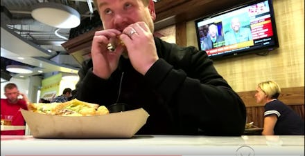 Corden makes his way to the airport — where he briefly shows a group of protesters outside the entrance — before he goes through the usual rounds of airport security. It's all rather mundane; he eats a grilled cheese sandwich ahead of the trip and eventually boards his flight after exchanging pleasantries with the employee checking his ticket. But as Corden walks toward his plane, the screen goes black and a message is relayed: