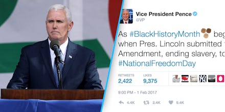 Aside from turning the end of slavery into a white savior narrative, Pence's first tweet about Black History Month as vice president only references black people as slaves. In a month meant to highlight black accomplishment, the vice president chose to reference only black oppression.