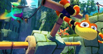 Players will control Noodle the snake as he slithers across various colorful locales, including a section of verdant greenery and stones with obstacles scattered throughout the path. Noodle obviously moves a lot different than a character with legs would, so you'll have to adapt to snakelike controls as you make your way around each level. There's also a small hummingbird character who offers assistance, which may remind you of games like Banjo-Kazooie or the upcoming Yooka-Laylee.