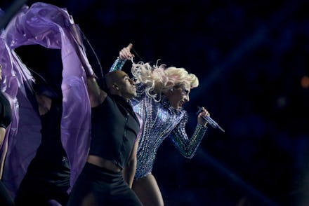 Gaga ditches her pink suit for a denim dress and hitches a ride on the back of a horse with a cowboy. But she doesn't stay there long. Donning a tight leather bodysuit and black cowboy hat, Gaga chases down a group of weapon-wielding men while on a motorcycle. From there, the music video features her grinding and drinking in a car with a "wild man" before eventually hitting a dog and crashing the car into a tree. It's a psychedelic ride that's a lot edgier and less family-friendly compared to her Super Bowl halftime performance.