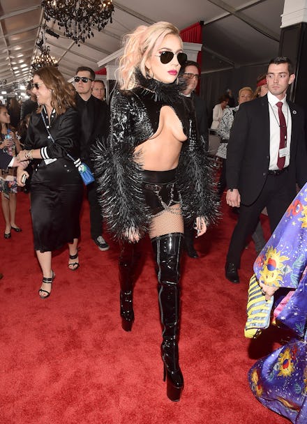 On the heels of a super ambitious Super Bowl halftime show, Lady Gaga showed up to the 2017 Grammy Awards red carpet wearing a black leather crop top — revealing plenty of sideboob and underboob — and black leather hot pants.