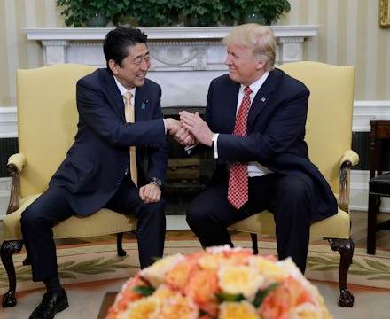 President Donald Trump welcomed Japanese Prime Minister Shinzo Abe to the White House on Friday in the traditional way: with a firm handshake followed by a playful slap on the hand, followed by an even firmer handshake, followed by a few seconds of uncomfortable, unbroken eye contact.