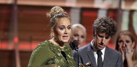 "I really do apologize for swearing," Adele said of her decision to begin again when she accepted the award for song of the year. "George Michael, I love him. He means a lot to me, so I'm really sorry if I offended anyone anywhere."