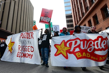Across the country, fast food workers with Fight For $15, a group dedicated to raising the minimum wage, marched on restaurants and offices to protest Trump's nominee, Andrew Puzder. Puzder serves as the CEO of CKE Restaurants, the umbrella company that owns Hardee's and Carl's Jr. burger chains.