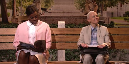 The SNL cold open sketch parodies the classic bus stop scene from the 1994 film, in which Tom Hanks as Gump tells the woman sitting next to him his mother's old phrase: "Life is like a box of chocolates. You never know what you're gonna get."