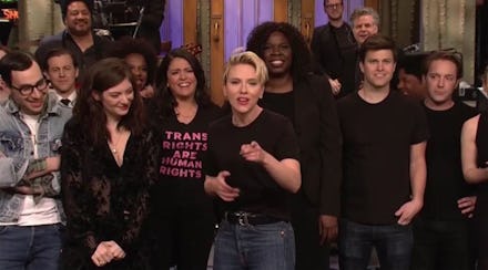 A lesser talked about moment happened after the show, during SNL's curtain call. Sandwiched between host Scarlett Johansson and musical guest Lorde, stood Cecily Strong wearing a five-word statement emblazoned on her chest: "Trans rights are human rights."