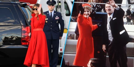 Almost immediately, outlets like Vogue saw the similarity between this red coat and the all-red coat ensemble Nancy Reagan wore to the 1981 inauguration, identical in color, shape and even length.