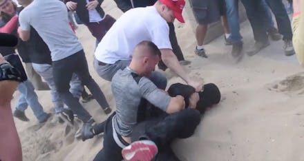 "Yeah, knock that little bitch out," someone in the pro-Trump crowd shouted as they advances on the retreating anti-Trump protesters.