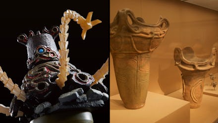 Jomon's clearest influence on Breath of the Wild is its rope pattern design and the ancient pottery that was decorated in that style. The Shrine dungeons throughout the new Zelda game and the Guardian enemies both draw direct influence from these prehistoric pots. You can even outfit Link with a special protective "ancient" helmet based on the same design.