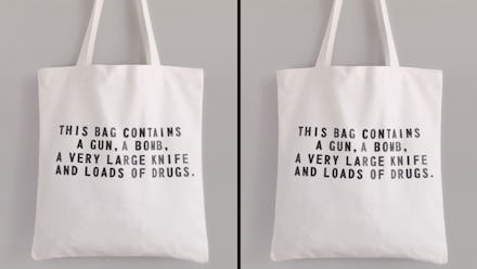On a plain canvas tote bag, it reads: "This bag contains a gun, a bomb, a very large knife and loads of drugs."