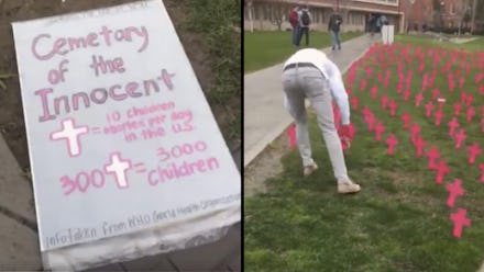 The cemetery dismantling may recall a similar incident at Texas State University, in which a man who went ham on some anti-abortion propaganda displayed on campus. Mic has yet to identify that culprit, but in a viral video, he can be seen methodically setting down the flowers, balloons and backpack he's carrying before absolutely ravaging a set of sandwich boards covered in graphic fetal imagery.