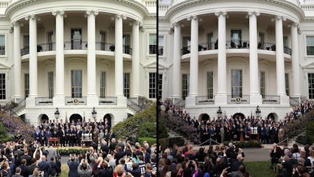 April 20, 2017, 12:10 p.m.: Following the tweet the New York Times posted that compared the turnout from the New England Patriots' visits to the White House in 2015 and 2017, the Patriots responded by saying the team's staff was included in the 2015 podium photo but for Wednesday's visit, they were seated on the South Lawn and were not in the photo. The Times issued a correction and removed the photo comparison. Mic's original story appears below with the photo comparison tweet removed. The headline has also been updated.