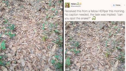 At first glance it just looks like a pile of sticks and leaves — but there's actually a snake hidden in this viral photo.