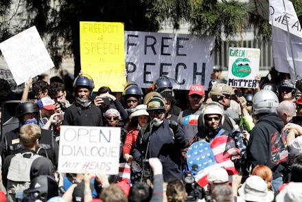 Protesters — some wearing flak jackets and helmets — criticized the university for canceling Coulter, accusing the "home of the free speech movement" of stifling the conservative troll's ability to express her views.
