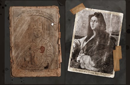 When those codes are entered into the Enigma machine, the three green lights at the top will light up, and you'll be taken to a screen with a dossier. The dossier has two pictures in it: a weathered print of Frederick Barbarossa, and a copy of Rafael's "Portrait of a Young Man."