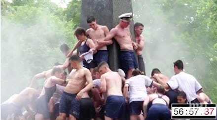 The video featured first-year Naval Academy students, or "plebes," forming a human pyramid in an attempt to place a naval academy hat at the top of an obelisk.