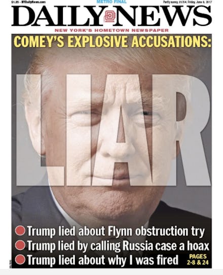 Capping off a day filled with hours of testimony by former FBI Director James Comey on the nature of communications he had with President Donald Trump amid an ongoing investigation into possible Russian hacking in the 2016 presidential election, the New York Daily News tweeted out a photo of its Friday cover.