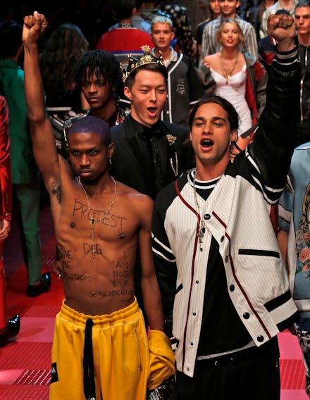 During the finale, one model in the show, the Atlanta musician Raury, appeared shirtless with the words "Protest," "I am not your scapegoat" and "DG Give Me Freedom" written across his chest. At one point, he held his fist in the air with another model beside him.