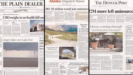 Mic compiled newspaper front pages from the biggest newspapers in 18 states where senators are still on the fence about the bill. Fourteen feature a front-page story about the health care bill, 10 of which lead with the CBO report specifically. Here are all of the undecided senators' most recent statements regarding their position on the bill; beneath each is an image of the front page of the Tuesday issue of a prominent paper from their respective state.