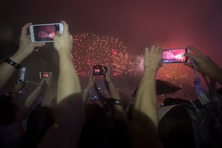 The firework’s color is dependent on the chemicals used. As the Verge noted, a strontium compound yields red, a barium compound yields green, a copper compound yields blue and a sodium compound yields a yellow-orange.