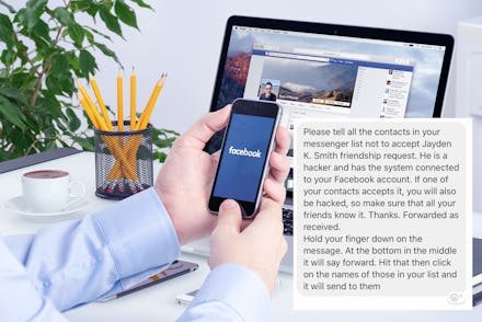 “Please tell all the contacts in your Messenger list, not to accept Jayden K. Smith friendship request,” one message reads. “He is a hacker and has the system connected to your Facebook account. If one of your contacts accepts it, you will also be hacked, so make sure that all your friends know it. Thanks. Forwarded as received.”