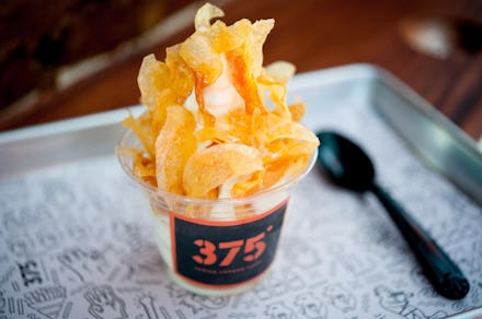 At 375 Fries, the vanilla soft serve acts as the base. The honey-glazed potato chips are then added, and then the treat is topped with apple crumbs and honey-butter syrup. Both the ice cream and the apple topping are made better by the potato chips, and the texture — which is crucial to taste — is improved, too. The result is a delightful juxtaposition of salty and sweet, soft and crunchy.