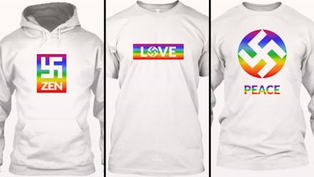 With an intent to “reclaim the symbol,” KA Design had mocked up a slew of T-shirts and sweatshirts all emblazoned with the swastika symbol, the most recognizable icon of Nazi propaganda, ironically against a rainbow background, with words like “Peace” and “Zen” and “Love” written below it.