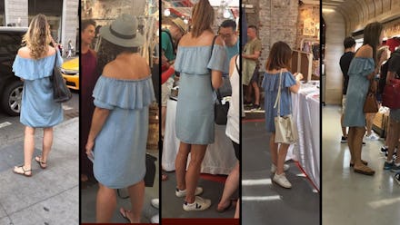 She assumed the trend would die down — until this past June, when she again spotted a woman wearing the dress in her neighborhood. “At that point, I decided to share my photos on Facebook and almost immediately, friends were sending their own sightings my way.” In early August, she moved the collection to a blog, where she added captions “to really tell the narrative of the blue off-the-shoulder dress,” she said.