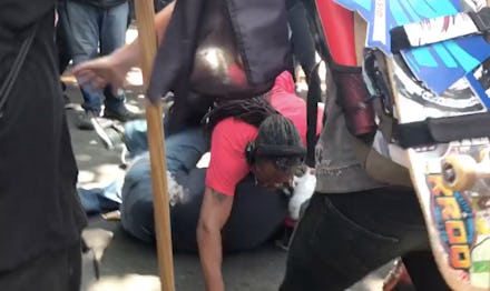 In the seconds following, the conflict died down, and the crowd scattered as other fights broke out nearby and police tossed smoke grenades to disperse the antifascists and reporters in the area.