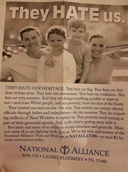 The monochrome paper leaflets displayed innocuous stock images of smiling families and adolescent white boys and girls strolling through tranquil fields. Ominous, bold-font warnings, like “THEY HATE US” and “MISSING: A future for white children,” were etched at the top and bottom of the pages.
