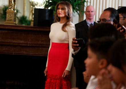 To round out this week, Trump appeared on Friday at a Hispanic Heritage Month event at the White House in her boldest look of the week: a light cream sweater worn with a bright reddish-pink skirt that had flowery detailing and a ruffle at the bottom, which kind of looked like a nod to flamenco skirts.