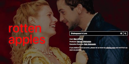 For example, if you search for Shakespeare in Love, you’ll see bright red text that says “rotten apples,” informing you that at least one person accused of sexual misconduct was involved in the creation of that particular movie. In the case of Shakespeare in Love, it lists Ben Affleck, Harvey Weinstein and Bob Weinstein. Each person’s name is a hyperlink that’ll take you to an article to show you what they’ve been accused of.
