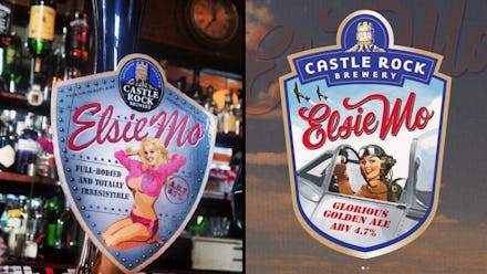 On Monday, Castle Rock Brewery in Nottingham, England, announced it was rebranding its “Elsie Mo” beer label. Look at the evolution of Castle Rock’s “Elsie Mo” label from buxom babe to scantily clad blonde to badass fighter pilot.