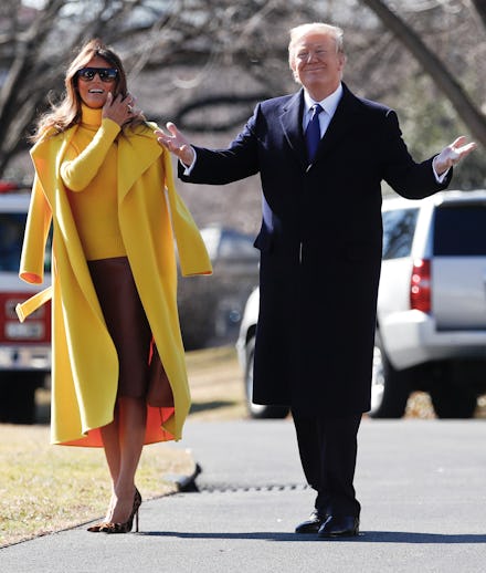 For a day trip to Ohio, Trump again shocked us with a bit of color. Wearing a brown leather skirt and leopard print heels, she opted for a bright mustard-colored sweater and matching coat from Ralph Lauren thrown overtop.