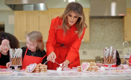 For Valentine’s Day, Trump visited children at the National Institutes of Health, where she helped construct valentines and decorate cookies in a bright road coat by Calvin Klein and black patent leather heels.