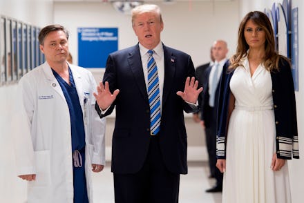 On Feb. 16, Trump and her husband visited a hospital in Florida that was treating a number of those wounded in the Parkland shooting. For the visit, she wore a long white dress with a belt at the waist, and a blue and cream Ralph Lauren cashmere cardigan.