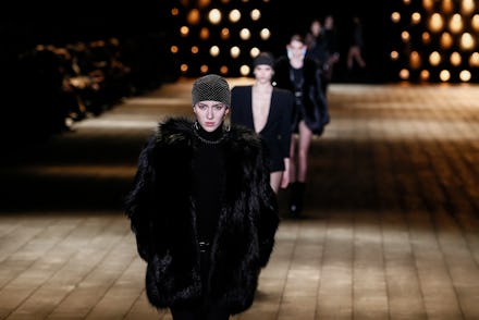 At the Saint Laurent show in Paris this week, models strutted around in little leather shorts and almost entirely black, on a runway lit from the back and above by a grid of spotlights.