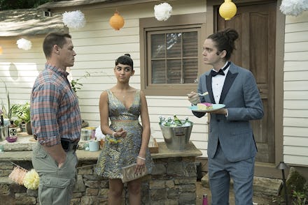 Cena’s character, Mitchell, is the one who most strays into the caricature of an overprotective father guarding his daughter’s virginity. That earns him an educational lecture from his feminist wife, Marcie (played by Sarayu Blue) — and later his daughter — about why women should be trusted to make their own choices about their bodies.