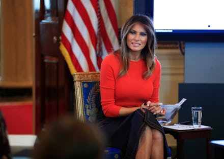 For speaking to a group of 13 middle-school students at the White House, Melania Trump opted for a more casual outfit than what she usually wears, pairing a red crew-neck sweater with a denim skirt featuring a zipper straight down the front by Italian brand Agnona.