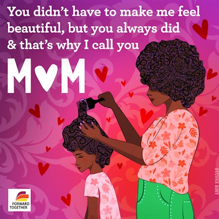 Forward Together commissioned five artists Amir Khadar, Francis Mead, Iman Geddy, Jamilla Okubo and Loveis Wise to illustrate vibrant e-cards celebrating black mothers. Through the organization’s website, anyone can customize the e-cards with messages and email them out to their mothers.