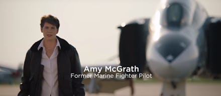 The ad begins with an image of the door of a helicopter Hegar was flying in Afghanistan before it was shot out of the sky by the Taliban and crashed. It goes on to talk about surviving domestic abuse (her mother was thrown through a glass door by her father) and the doors that were closed in her face when she was fighting to get women the right to serve in ground combat. Hegar ended up successfully suing the Pentagon to allow women to serve in ground combat.
