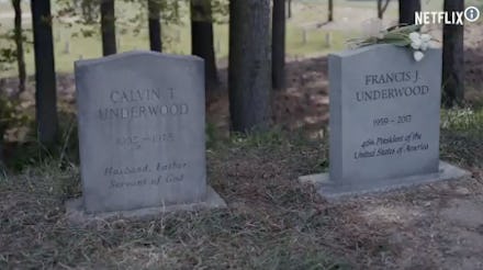 The most recent season of House of Cards ended with Frank resigning the presidency and Claire taking over, then seeming to double-cross Frank, whom she had promised to pardon. Presumably, the sixth and final season will include some explaining as to how we got from there to Frank’s gravesite.
