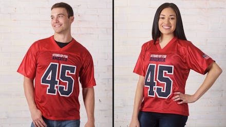 The Stand Up for America Men’s Football Jersey, which retails for $99 (the same price the NFL sells its jerseys for), has a 45 on the front and back and is embroidered with “Stand Up for America” on the front and “Trump” across the back. There’s also an American flag on its sleeve.