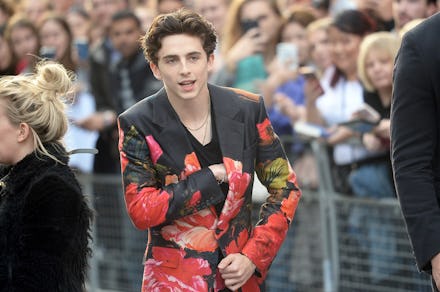 Chalamet opted for a shoulder-to-hem red blossom Alexander McQueen autumn/winter 2018 suit.