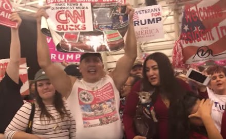 “Fake news,” of course, is a phrase popularized by Trump. And CNN, the target of the chanting in the video, was also one of the targets of the aforementioned mail bombs. On Wednesday, CNN’s offices at the Time Warner Center in New York were evacuated after a bomb was found in the building’s mailroom.