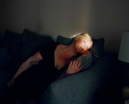 But the artist in Untitled No. 55 lets us in with the kind of vulnerability that made Davis’ work so compelling all along. She looks restless, even as she dozes alone on the couch in her living room. Blinding light shines in from the window, striking her forehead, and revealing a woman at rest, but not necessarily at peace. Davis' work has always been marked by her exploration of intimacy. In Fantasy No. 1, from 2004, she lies awake, in bed, with a sleeping man’s arm beside her. Of this photograph, Davis wrote, "I wanted to know what it felt like to have a guy desire me." In these earlier, staged photographs of intimate moments, Davis appears uniformly uncomfortable. In Steve and I, from 2006, she sits on the edge of a bed, covered completely by a blanket, glancing uneasily at the camera.