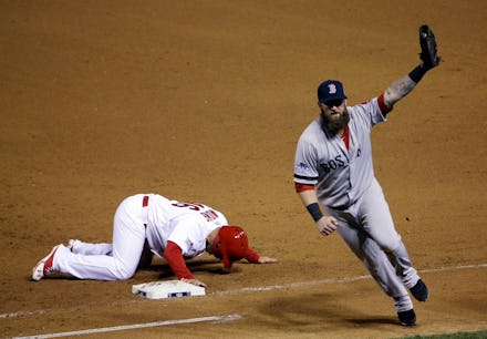 Jon Jay grounded one toward the middle, Dustin Pedroia stabbed it, jumped to his feet, and threw out Yadier Molina coming home. Catcher Jarrod Saltalamacchia then threw wide of third, trying to catch Allen Craig advancing from second base. The ball trickled into foul territory and Craig, attempting to score the game-winner, tripped over third baseman Will Middlebrooks who had been sprawled on the ground.